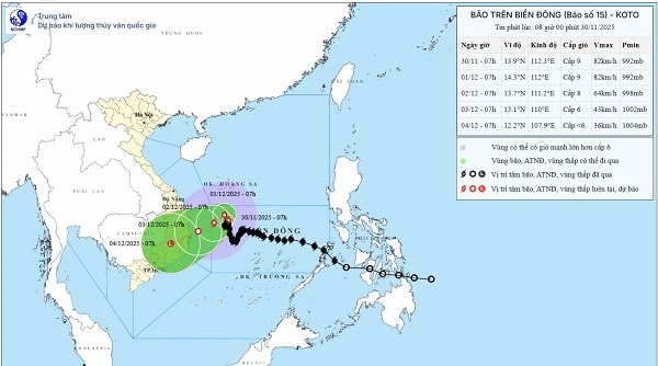 Theo đó, lúc 7 giờ ngày 30.11, vị trí tâm bão số 15 ở vào khoảng 13,9 độ vĩ bắc; 112,3 độ kinh đông, trên vùng biển phía tây bắc khu vực Giữa Biển Đông. Sức gió mạnh nhất vùng gần tâm bão mạnh cấp 9 (75-88km/giờ), giật cấp 11. Di chuyển theo hướng bắc đông bắc, tốc độ khoảng 3km/giờ.
