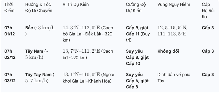 Dự báo cho thấy bão sẽ có sự thay đổi về hướng di chuyển và cường độ, tiềm ẩn rủi ro rất lớn cho hoạt động hàng hải. Vùng nguy hiểm (vùng có gió mạnh cấp 6 trở lên) được xác định tập trung trong khoảng 12,5°N đến 15,5°N và 111°E đến 113,5°E trong 48 giờ đầu.