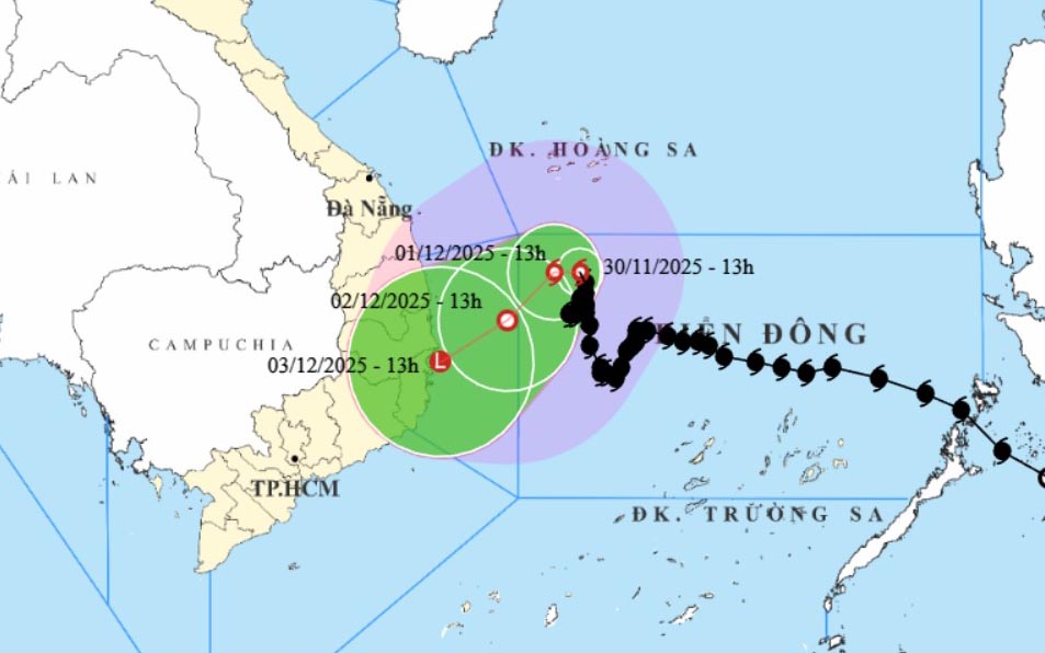 Hồi 13 giờ ngày 30/11, vị trí tâm bão ở vào khoảng 14,3 độ Vĩ Bắc; 112,2 độ Kinh Đông, trên vùng biển phía tây bắc khu vực giữa Biển Đông. Sức gió mạnh nhất vùng gần tâm bão đạt Cấp 9 (từ 75 đến 88km/giờ), giật cấp 11. Bão đang di chuyển chậm theo hướng bắc.