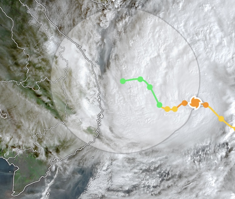 Ảnh vệ tinh mây bão lúc 7 giờ 10 phút ngày 27-11 và dự báo quỹ đạo di chuyển theo mô hình của Hoa Kỳ. Ảnh: Z.E