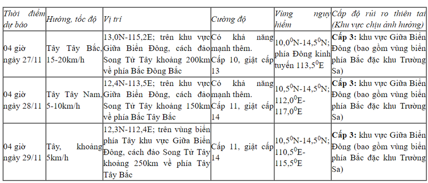 Dự báo trong các ngày 27-28/11, khu vực này tiếp tục chịu ảnh hưởng mạnh hơn, với gió có khả năng tăng lên cấp 11, giật cấp 14; sóng cao 7-9 m, biển động dữ dội.