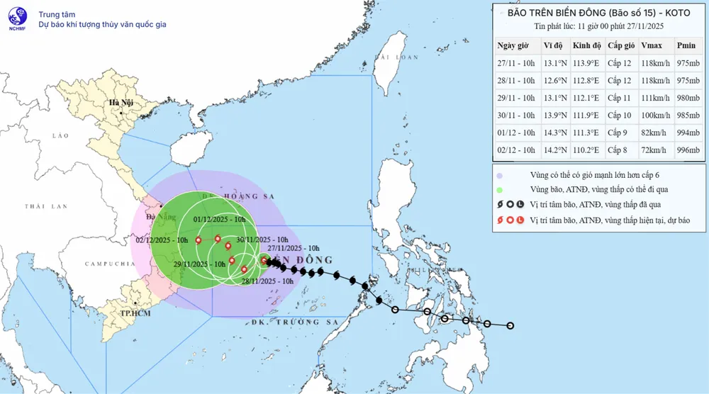Trưa 27-11, Trung tâm Dự báo Khí tượng thủy văn quốc gia, cho biết lúc 10 giờ, tâm bão số 15 (tên quốc tế là Koto - tức Đàn hạc), đang ở vào khoảng 13,1 độ Vĩ Bắc; 113,9 độ Kinh Đông, cách đảo Song Tử Tây khoảng 190 km về phía Bắc. Tốc độ di chuyển của bão rất chậm, chỉ 5-10 km/giờ.