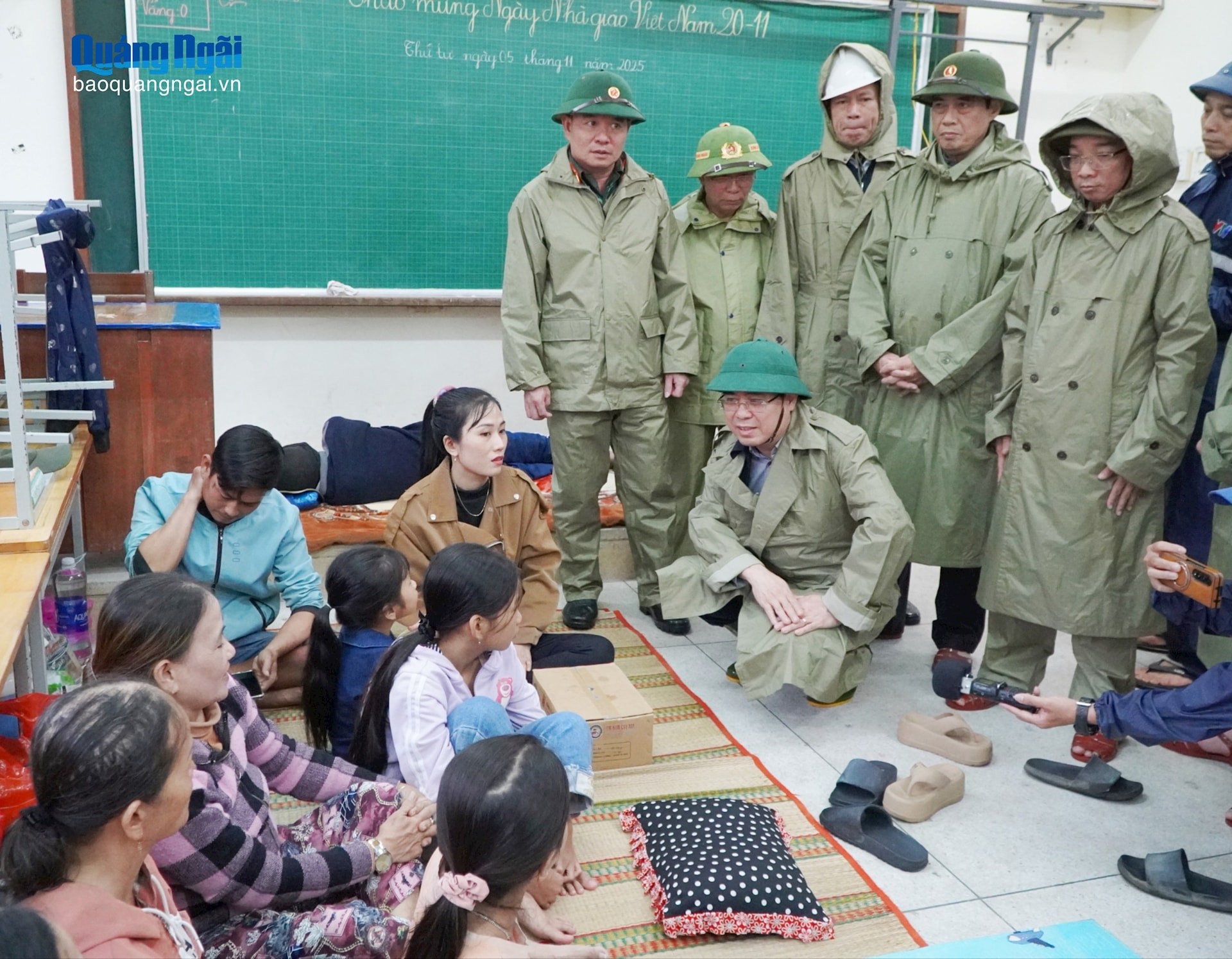 Phó Bí thư Tỉnh ủy, Chủ tịch UBND tỉnh Quảng Ngãi Nguyễn Hoàng Giang thăm hỏi, động viên người dân xã Long Phụng tại nơi di dân tập trung tránh bão số 13. Ảnh: Thanh Nhị