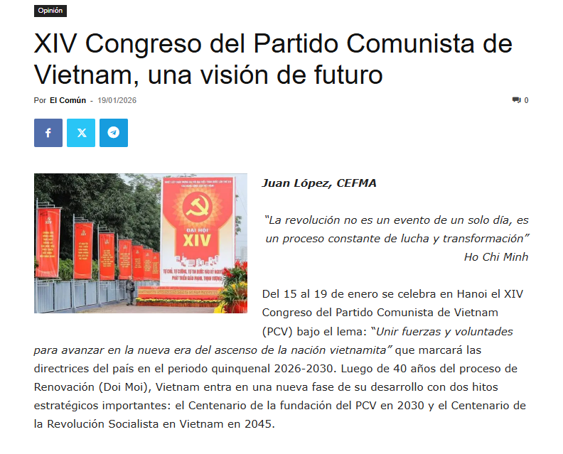 Bài viết của học giả Juan López với tiêu đề “Đại hội Đảng Cộng sản Việt Nam lần thứ XIV: Tầm nhìn cho tương lai” đăng trên báo Elcomun của Tây Ban Nha