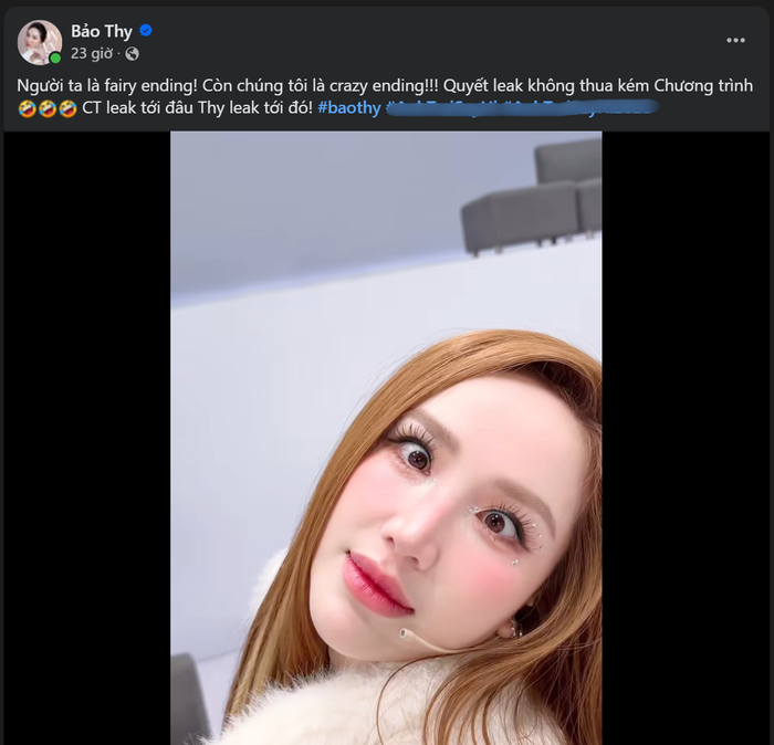 Không chỉ ghi điểm bởi nhan sắc lão hóa ngược, Bảo Thy còn khiến người hâm mộ thích thú với độ “xì tin” và hết mình khi hoạt động cùng dàn đàn em. Nữ ca sĩ thoải mái tham gia các trend vui nhộn, không ngại làm xấu để mang lại tiếng cười cho khán giả. Cô còn tự tay đăng clip hậu trường lên trang cá nhân với dòng caption cực kỳ hài hước: “Người ta là fairy ending, còn chúng tôi là crazy ending!”.