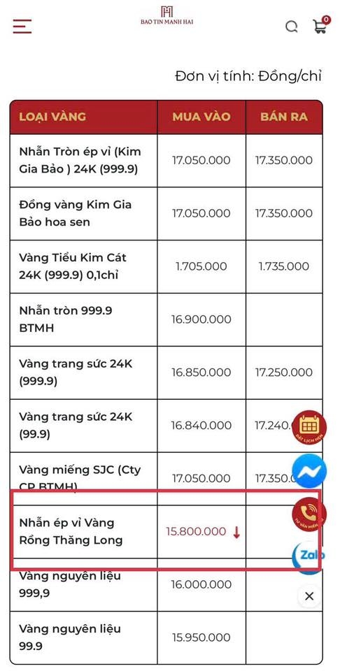 Thông báo giá mua bán vàng của Bảo Tín Mạnh Hải chiều 25/3.