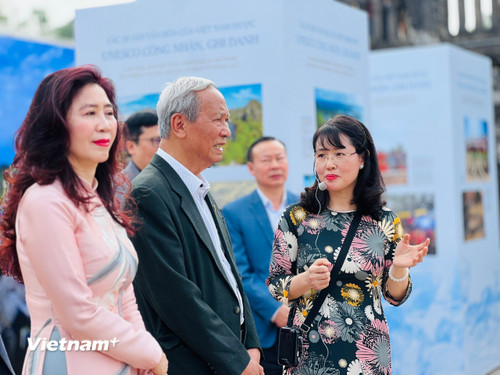 Phó Giáo sư, Tiến sỹ Đỗ Văn Trụ (giữa) tại một sự kiện trưng bày về di sản. (Ảnh: Mai Mai/Vietnam+)