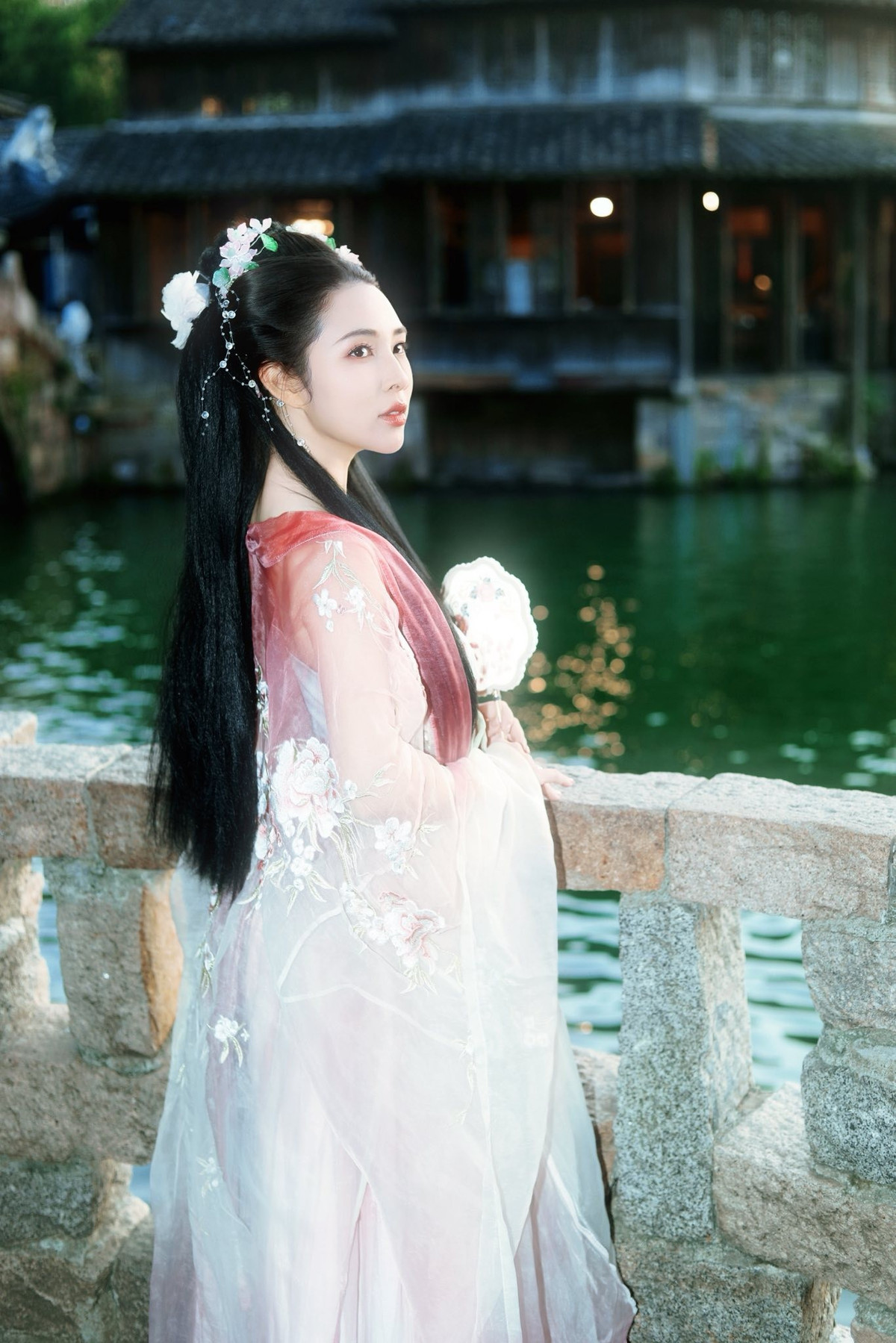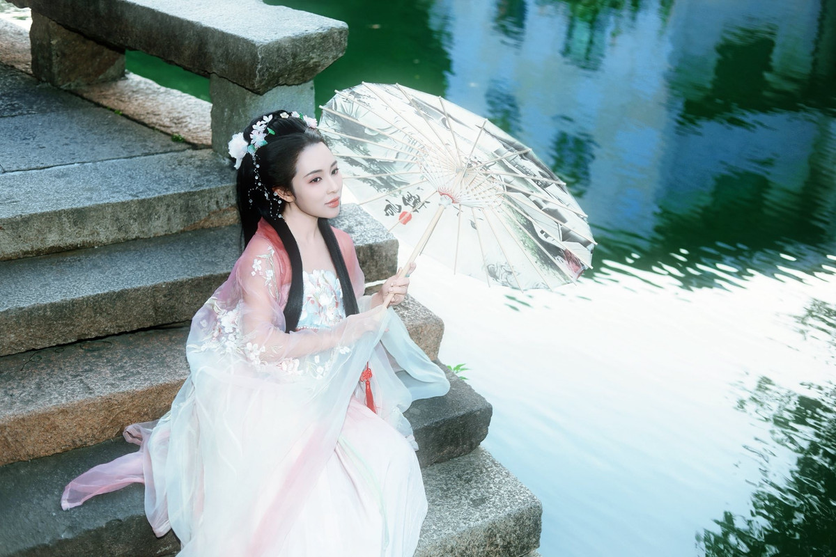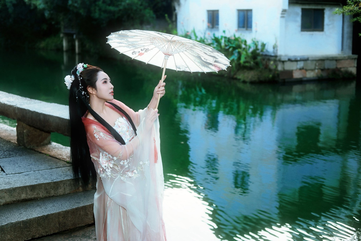 Trang phục cổ trang màu hồng phấn – trắng, được thêu hoa tinh xảo, kết hợp chất liệu voan mỏng manh, giúp nữ nhân vật trở nên nhẹ bẫng như hòa tan vào cảnh sắc. Dáng ngồi bên lan can gỗ, khoảnh khắc cầm chiếc ô giấy họa tiết cổ, hay khi đứng bên hồ nước lộng gió đều mang đến cảm giác như nàng bước ra từ một bức tranh thủy mặc.