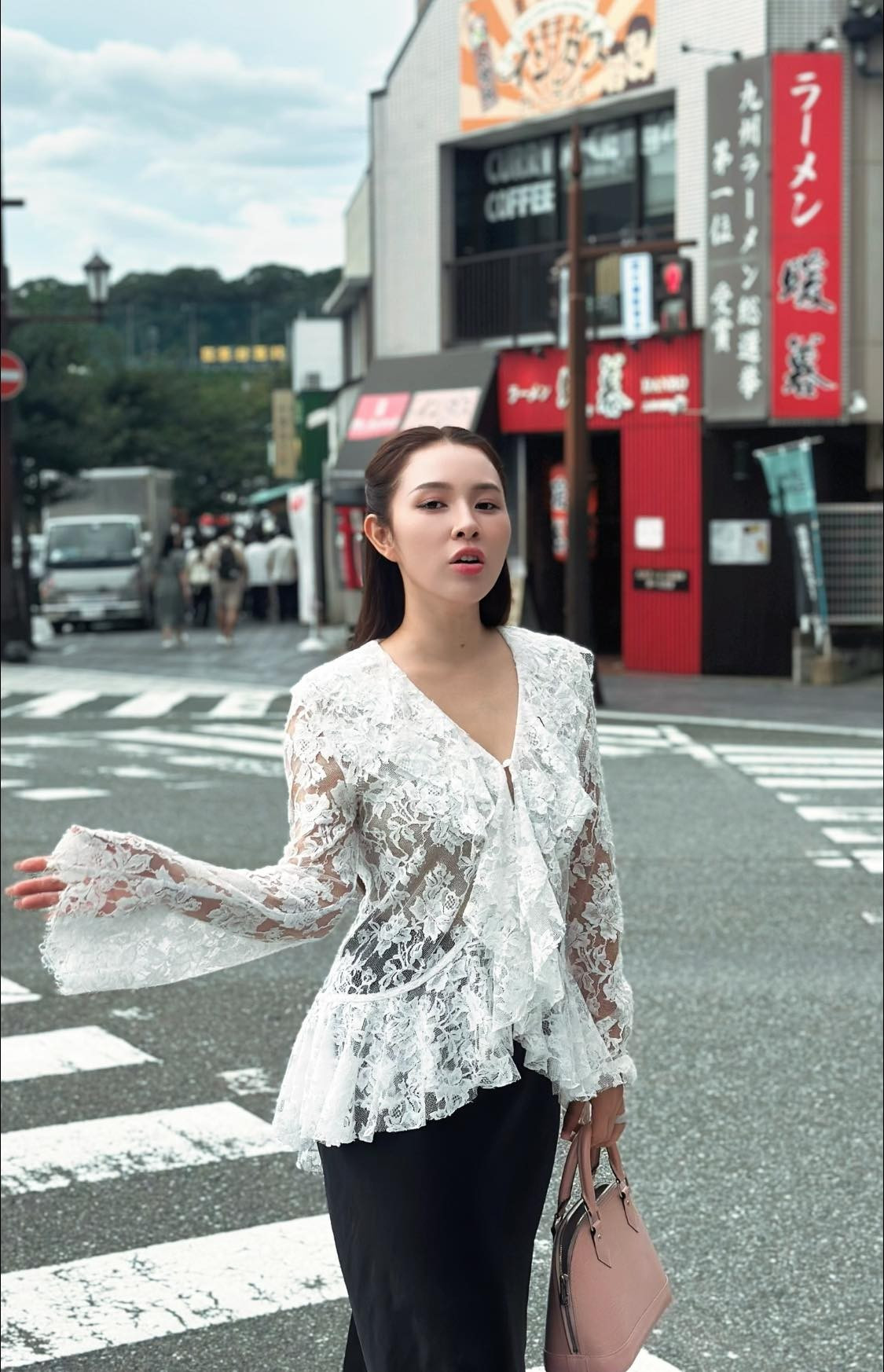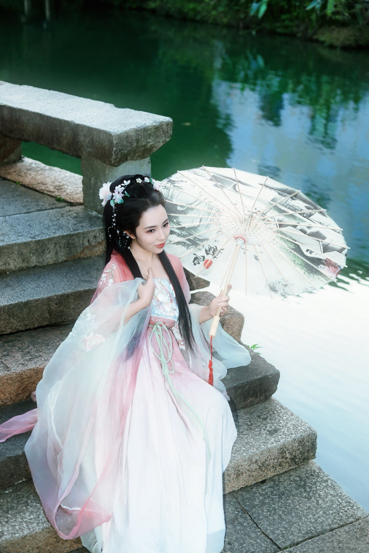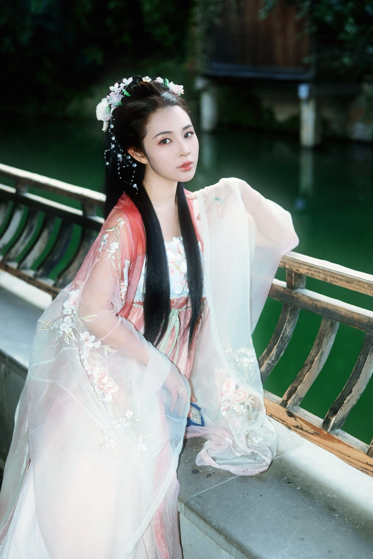 Trang phục cổ trang màu hồng phấn – trắng, được thêu hoa tinh xảo, kết hợp chất liệu voan mỏng manh, giúp nữ nhân vật trở nên nhẹ bẫng như hòa tan vào cảnh sắc. Dáng ngồi bên lan can gỗ, khoảnh khắc cầm chiếc ô giấy họa tiết cổ, hay khi đứng bên hồ nước lộng gió đều mang đến cảm giác như nàng bước ra từ một bức tranh thủy mặc.