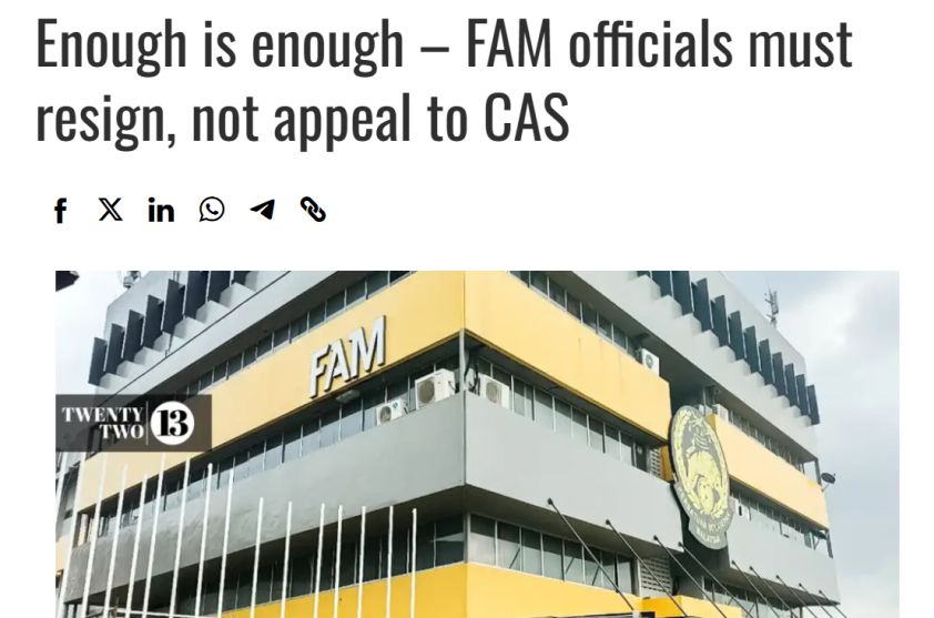 Twentytwo13 viết: "Thực tế, FAM đã thất bại toàn diện từ quản lý, kiểm soát nội bộ cho tới trách nhiệm lãnh đạo. Không có lý do nào biện minh cho việc tiếp tục đốt thêm tiền vào một vụ kiện mà cơ hội thắng gần như bằng không. Người hâm mộ Malaysia đã quá mệt mỏi với những lời xin lỗi lặp lại và những hứa hẹn suông. Cái mà họ cần bây giờ không phải là một bản kháng cáo mới, mà là sự chịu trách nhiệm thực sự".