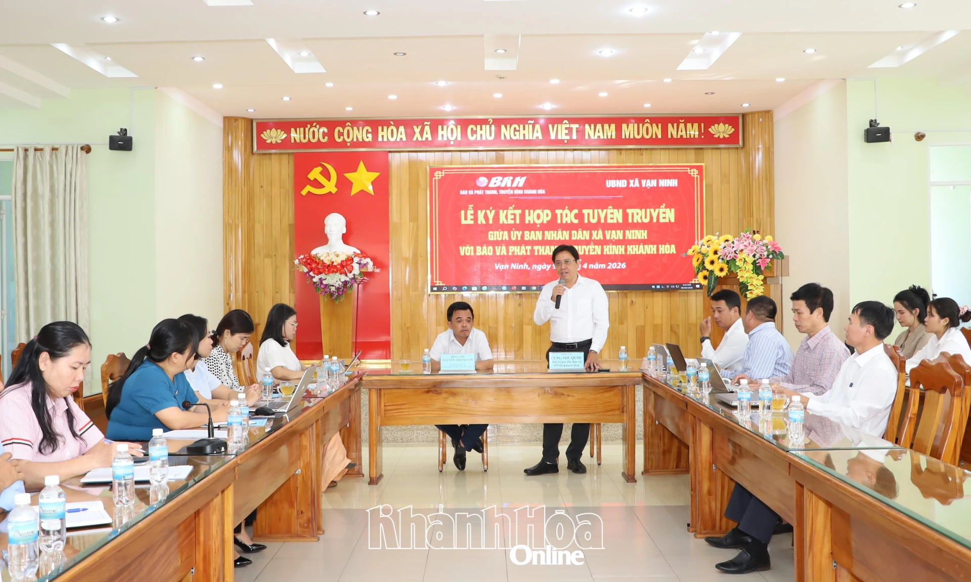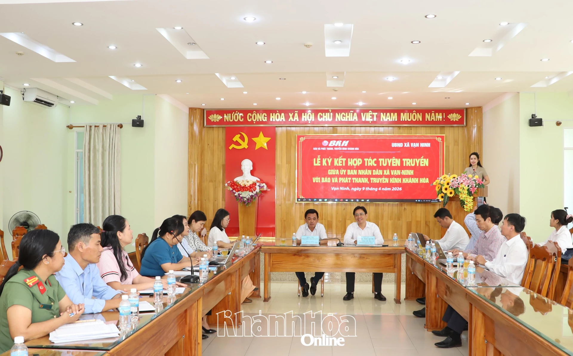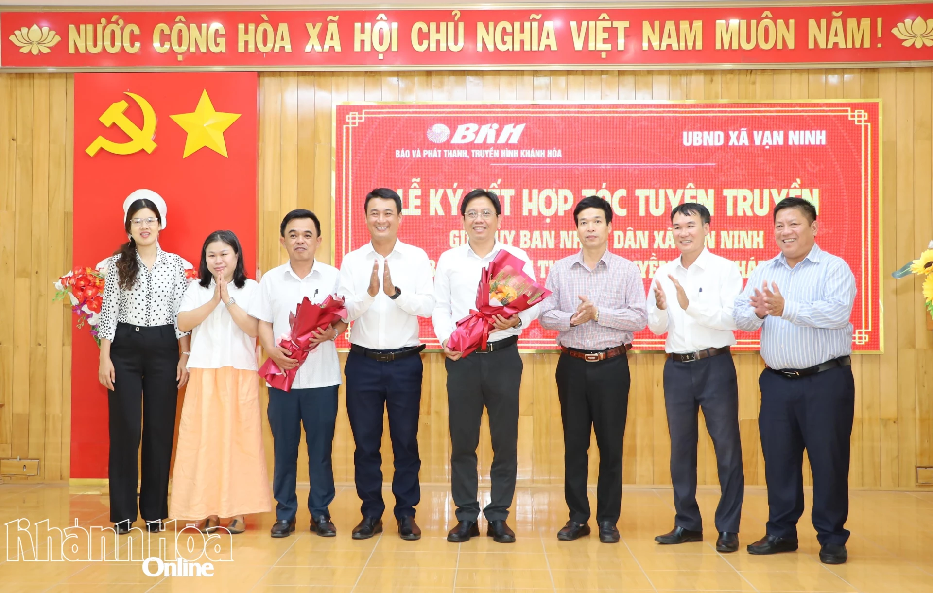 Chiều 9-4, Báo và Phát thanh, Truyền hình Khánh Hòa và UBND xã Vạn Ninh tổ chức ký kết biên bản ghi nhớ về việc phối hợp đẩy mạnh công tác thông tin, tuyên truyền về xây dựng Đảng và tình hình phát triển kinh tế, văn hóa, xã hội trên địa bàn xã. Tham gia lễ ký kết có các ông: Cung Phú Quốc - Phó Giám đốc Báo và Phát thanh, Truyền hình Khánh Hòa; Nguyễn Hữu Tuấn - Phó Bí thư Thường trực Đảng ủy xã; Nguyễn Thanh Sơn - Phó Bí thư Đảng ủy, Chủ tịch UBND xã; bà Nguyễn Thị Mân - Phó Chủ tịch HĐND xã; bà Trương Thị Mỹ Ý - Phó Chủ tịch UBND xã; lãnh đạo các phòng, ban của hai đơn vị.