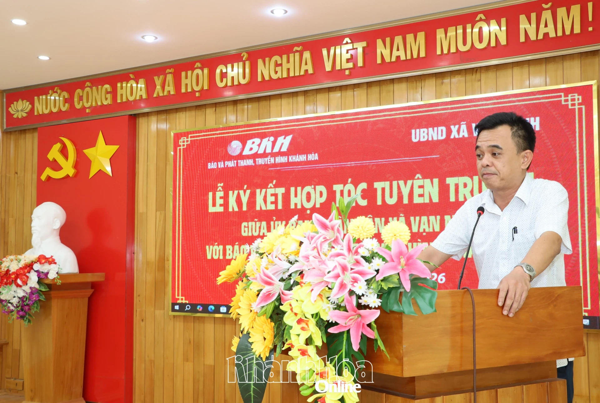 Phát biểu tại buổi lễ, ông Nguyễn Hữu Tuấn nhấn mạnh, việc địa phương ký kết với Báo và Phát thanh, Truyền hình Khánh Hòa chính là bước đi rất kịp thời và đúng hướng. Thông qua sự phối hợp với cơ quan báo chí của tỉnh, các chủ trương của Đảng, chính sách pháp luật của Nhà nước, kết quả thực hiện Nghị quyết Đại hội Đảng bộ xã nhiệm kỳ 2025 - 2030 cùng những thành tựu nổi bật trên các lĩnh vực của địa phương được truyền tải rộng rãi, sinh động và hiệu quả đến với Nhân dân trong và ngoài địa phương. Đảng ủy xã tin tưởng với thế mạnh của Báo và Phát thanh, Truyền hình Khánh Hòa sẽ đồng hành với địa phương trong xây dựng hình ảnh Vạn Ninh năng động, phát triển, giàu bản sắc, lan tỏa mô hình hay, cách làm sáng tạo, người tốt việc tốt, tạo động lực thúc đẩy các phong trào thi đua của địa phương. Để việc triển khai bản ghi nhớ đạt hiệu quả cao, UBND xã Vạn Ninh, Trung tâm Dịch vụ, sự nghiệp công và các bộ phận có liên quan chủ động phối hợp chặt chẽ với Báo và Phát thanh, Truyền hình Khánh Hòa trong việc xây dựng nội dung, cung cấp thông tin, tổ chức thực hiện đúng tiến độ, bảo đảm chất lượng.