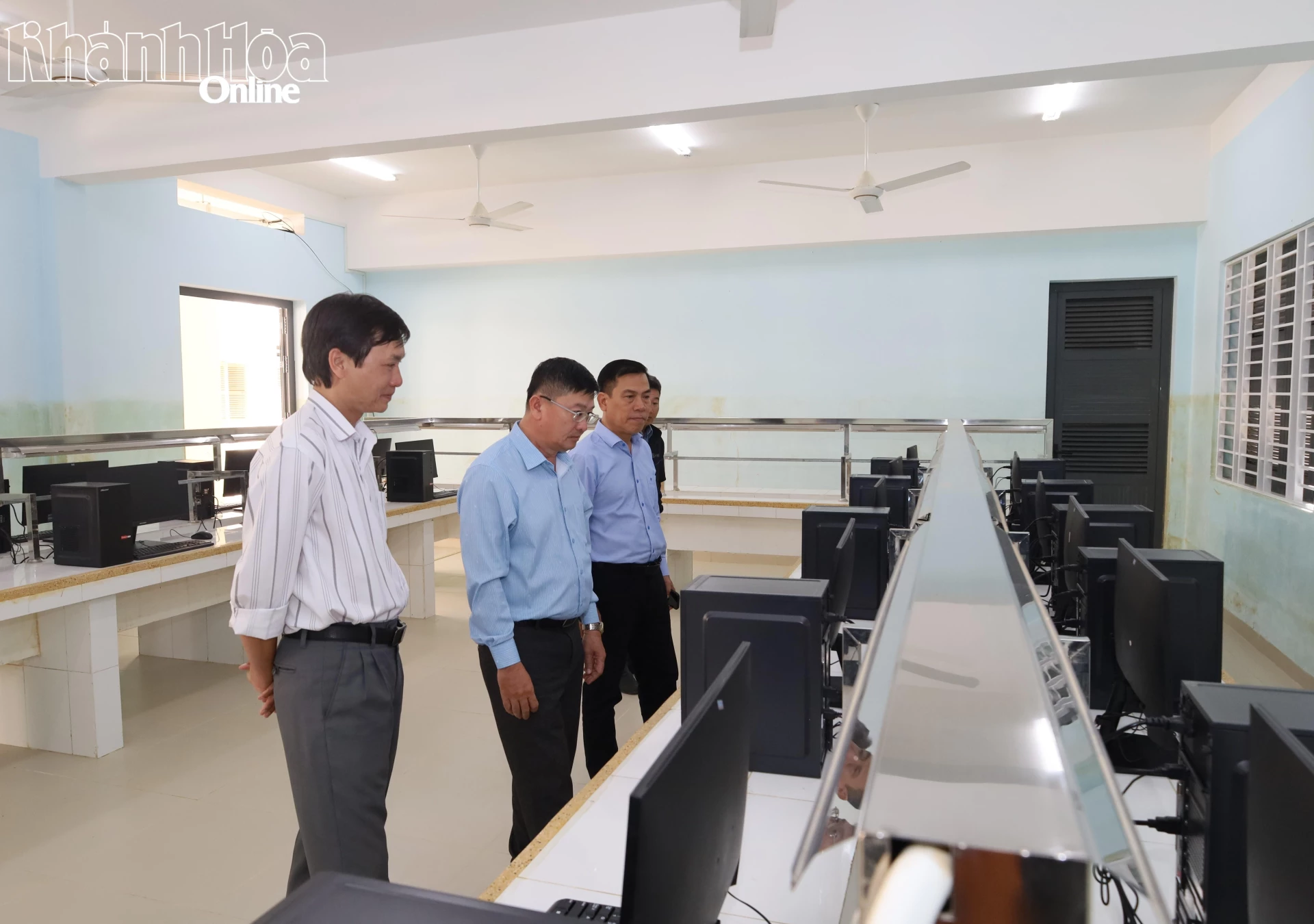 Lãnh đạo Báo và Phát thanh, Truyền hình Khánh Hòa cùng các đại biểu thực hiện nghi thức kéo băng khánh thành phòng máy vi tính do đơn vị trao tặng.