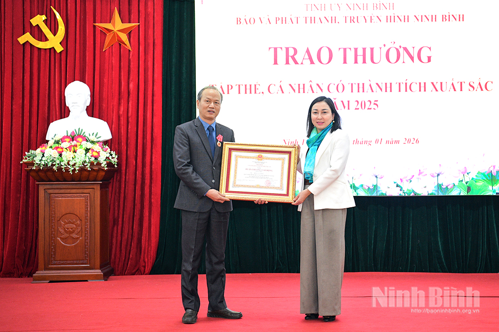Đồng chí Phạm Thị Thu Hằng, Ủy viên Ban Thường vụ Tỉnh ủy, Giám đốc Báo và phát thanh, truyền hình Ninh Bình trao Bằng khen của UBND tỉnh cho các cá nhân có thành tích xuất sắc trong năm 2025.