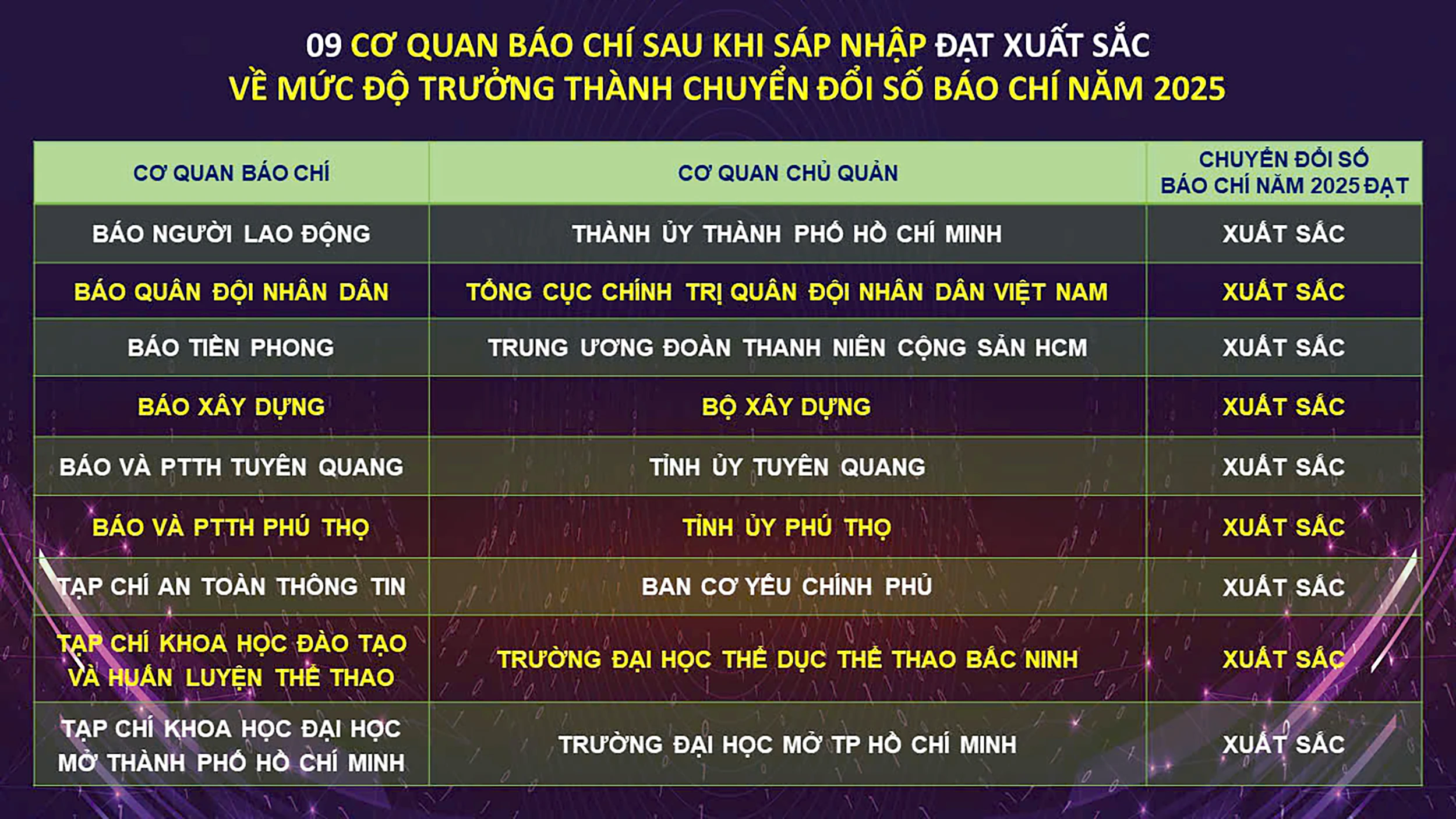 Các cơ quan báo chí đạt mức Xuất sắc về trưởng thành chuyển đổi số báo chí năm 2025 sau sáp nhập.