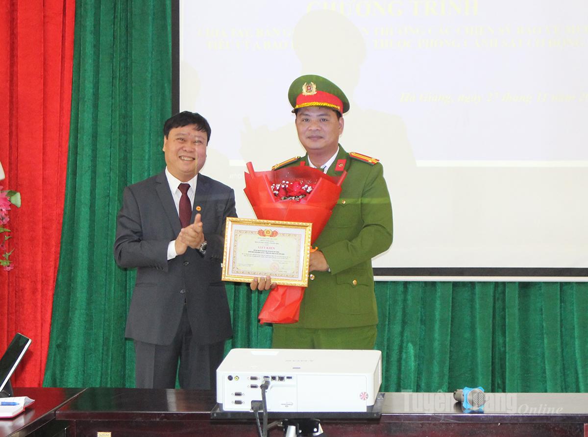 Đồng chí Tổng Biên tập Báo và phát thanh, truyền hình Tuyên Quang Mai Đức Thông tặng giấy khen cho Tiểu đội Cảnh sát bảo vệ mục tiêu.