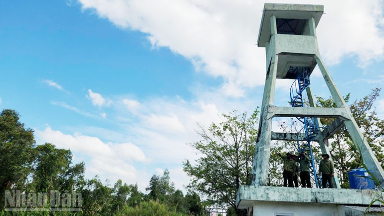 Lực lượng chuyên trách bảo vệ rừng tại Vườn quốc gia U Minh Thượng lên tháp quan sát những nơi có nguy cơ rừng bị xâm hại.