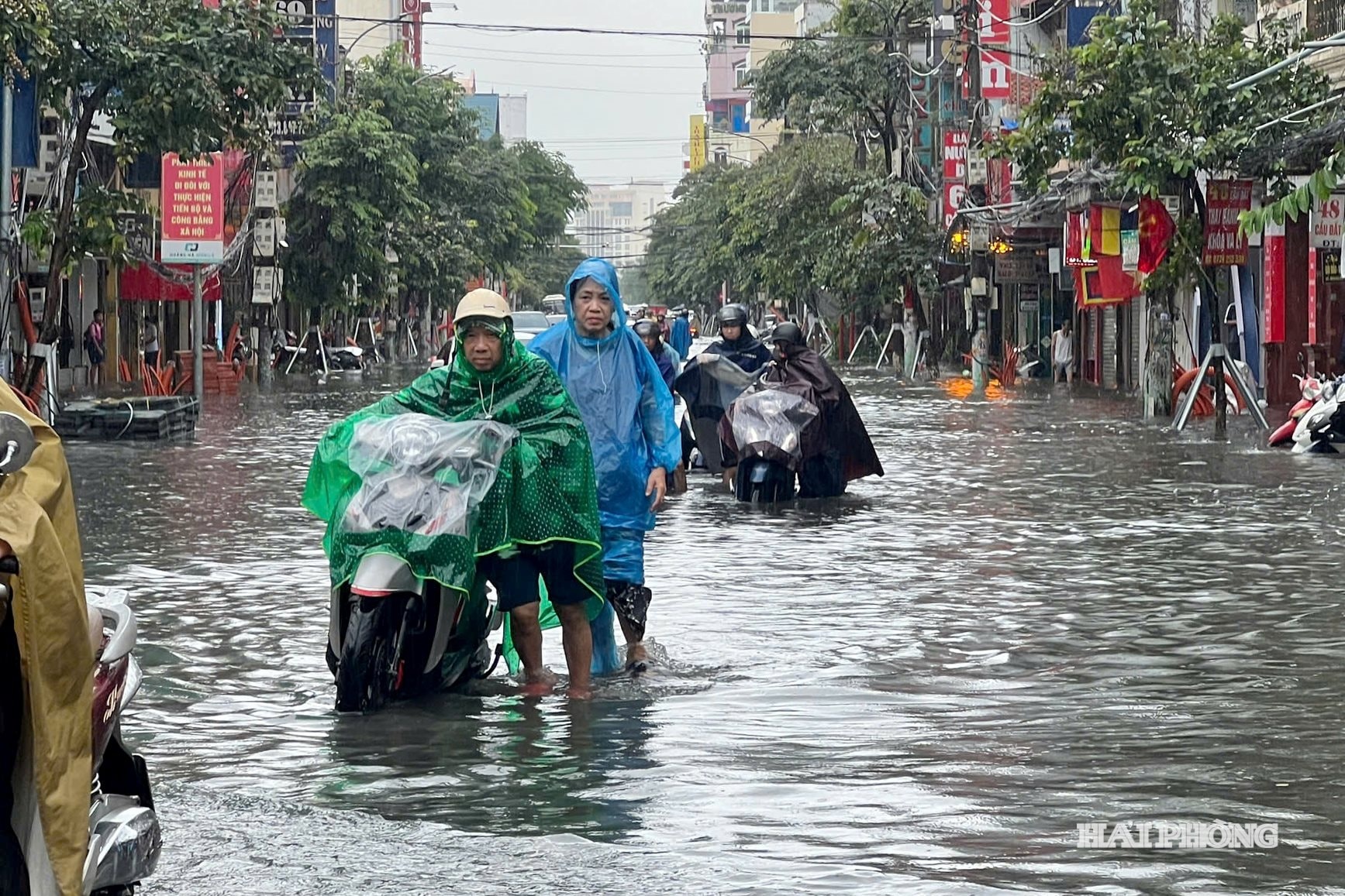 Trận mưa lớn sáng nay khiến nhiều tuyến đường trọng điểm ở Hải Phòng bị ngập sâu, nước tràn vào nhà dân và các cơ sở kinh doanh. Đến chiều 14/10, nhiều tuyến phố ở khu vực trung tâm vẫn chìm trong nước, giao thông hỗn loạn, ảnh hưởng nghiêm trọng đến đời sống và hoạt động buôn bán của người dân.