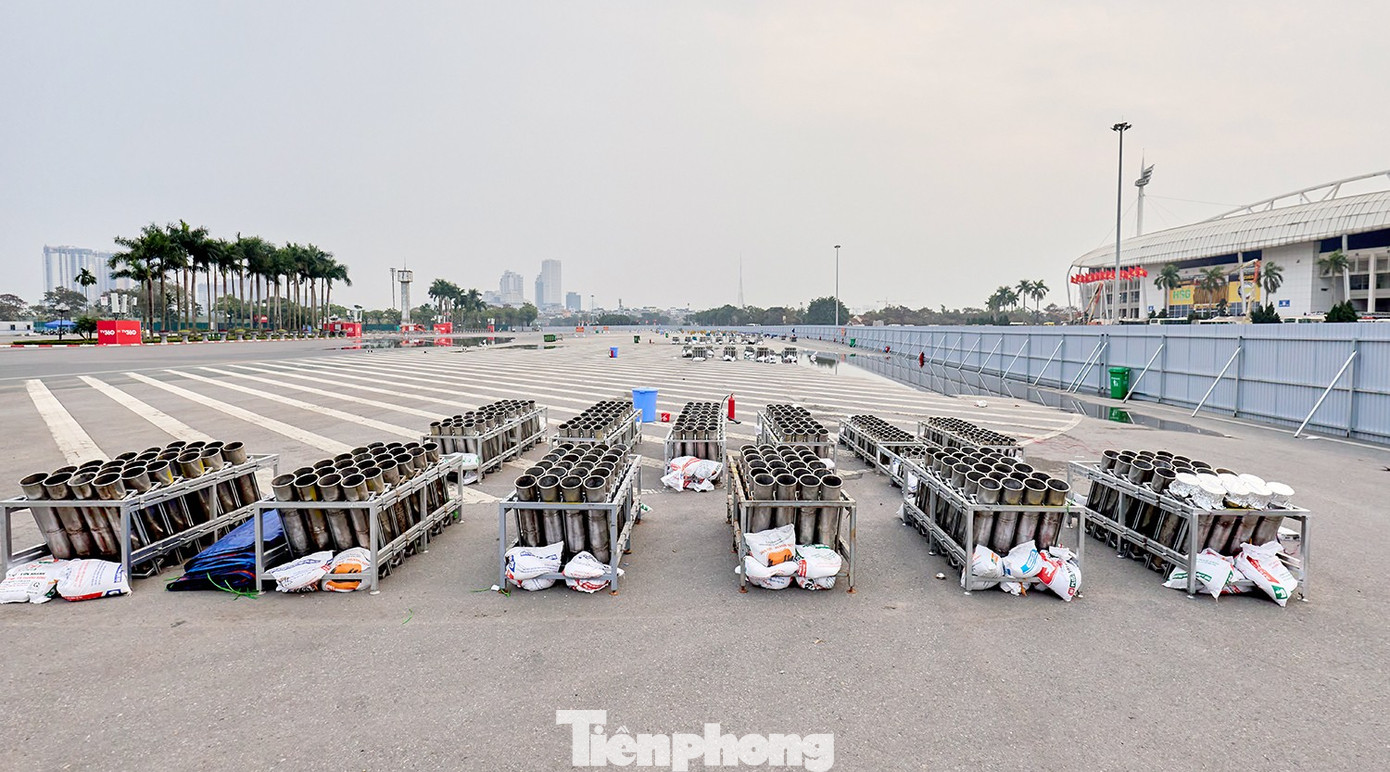 Chiều 23/1, khu vực phía trước sân vận động quốc gia Mỹ Đình được phong tỏa nghiêm ngặt. Bên trong hàng rào an ninh nhiều lớp, trận địa pháo hoa lớn nhất từ trước đến nay của Hà Nội đã hoàn tất lắp đặt, sẵn sàng khai hỏa phục vụ chương trình nghệ thuật đặc biệt diễn ra tối nay.