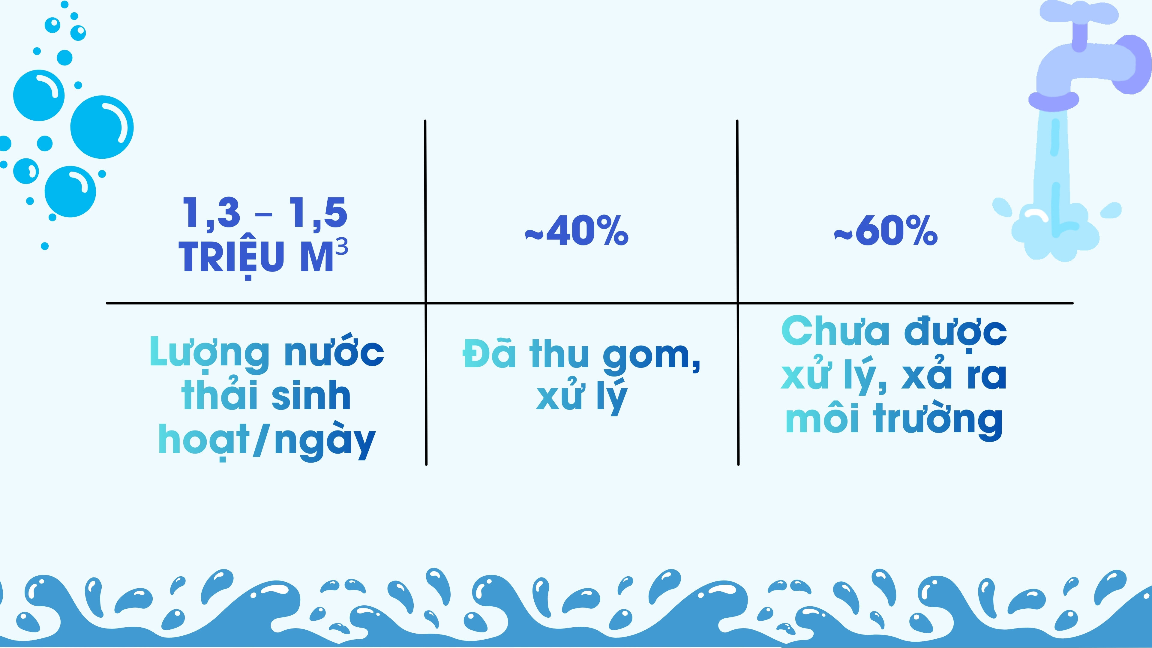 Mỗi ngày Hà Nội phát sinh khoảng 1,3 - 1,5 triệu m³ nước thải sinh hoạt, nhưng tỷ lệ thu gom, xử lý mới đạt khoảng 40%.