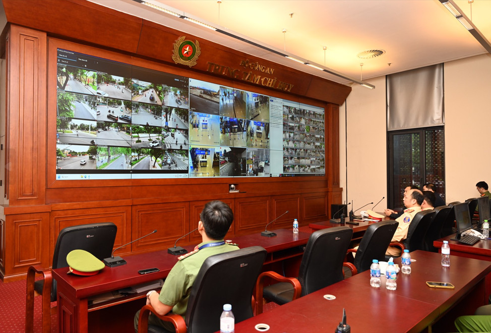 Lực lượng Cảnh vệ trực tại Trung tâm Chỉ huy tác chiến của Bộ Công an tại Trung tâm Hội nghị Quốc gia. Ảnh: Bộ Công an