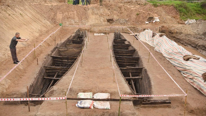 Toàn cảnh hai chiếc thuyển cổ sau khi được khai quật khẩn cấp tại thị xã Thuận Thành, tỉnh Bắc Ninh. (Ảnh: nhandan.vn)