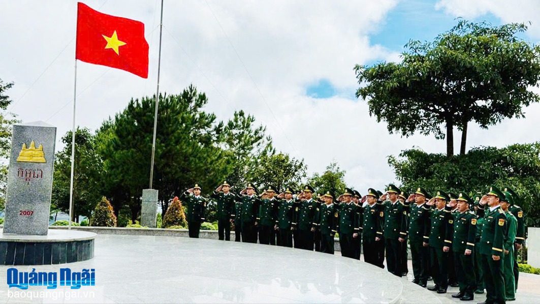 Cán bộ, chiến sĩ Đồn Biên phòng Cửa khẩu Quốc tế Bờ Y tổ chức Lễ chào cờ bên cột mốc Ngã ba biên giới Việt Nam - Lào - Campuchia dịp Lễ Quốc khánh 2/9/2025. Ảnh: ĐVCC
