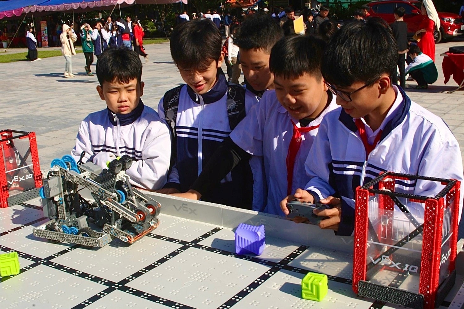 Các em học sinh vùng cao tỉnh Tuyên Quang lập trình điều khiển và trình diễn robot VEX IQ.