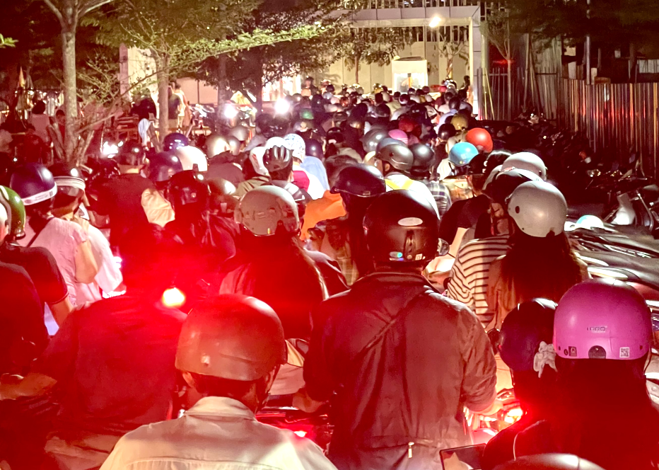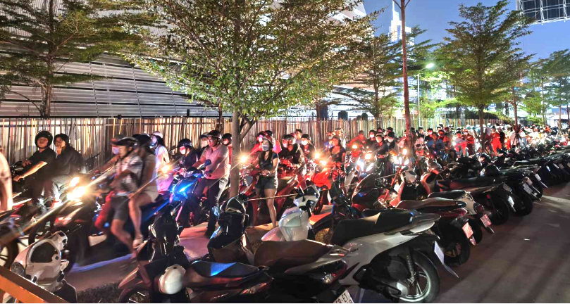Hàng trăm xe gắn máy xếp hàng dài chờ ra khỏi bãi giữ xe Công viên Bờ Sông, phường An Khánh vào buổi tối