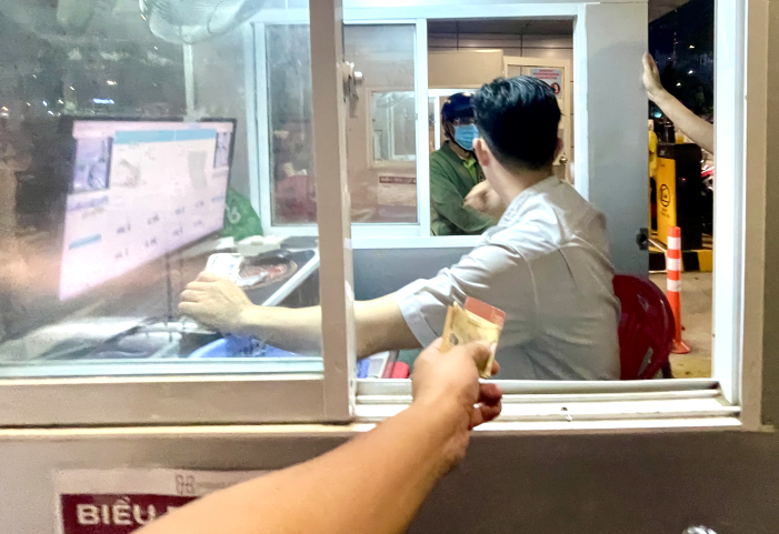 Trạm thu phí bãi giữ xe với hai làn ra nhưng chỉ một nhân viên soát thẻ và thu tiền