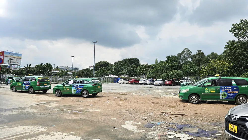 Bãi đệm sân bay Tân Sơn Nhất có lúc trống chỗ nhưng nhiều tài xế vẫn chọn dừng bên ngoài cho tiện, vi phạm quy định giao thông. Ảnh: PHẠM HẢI