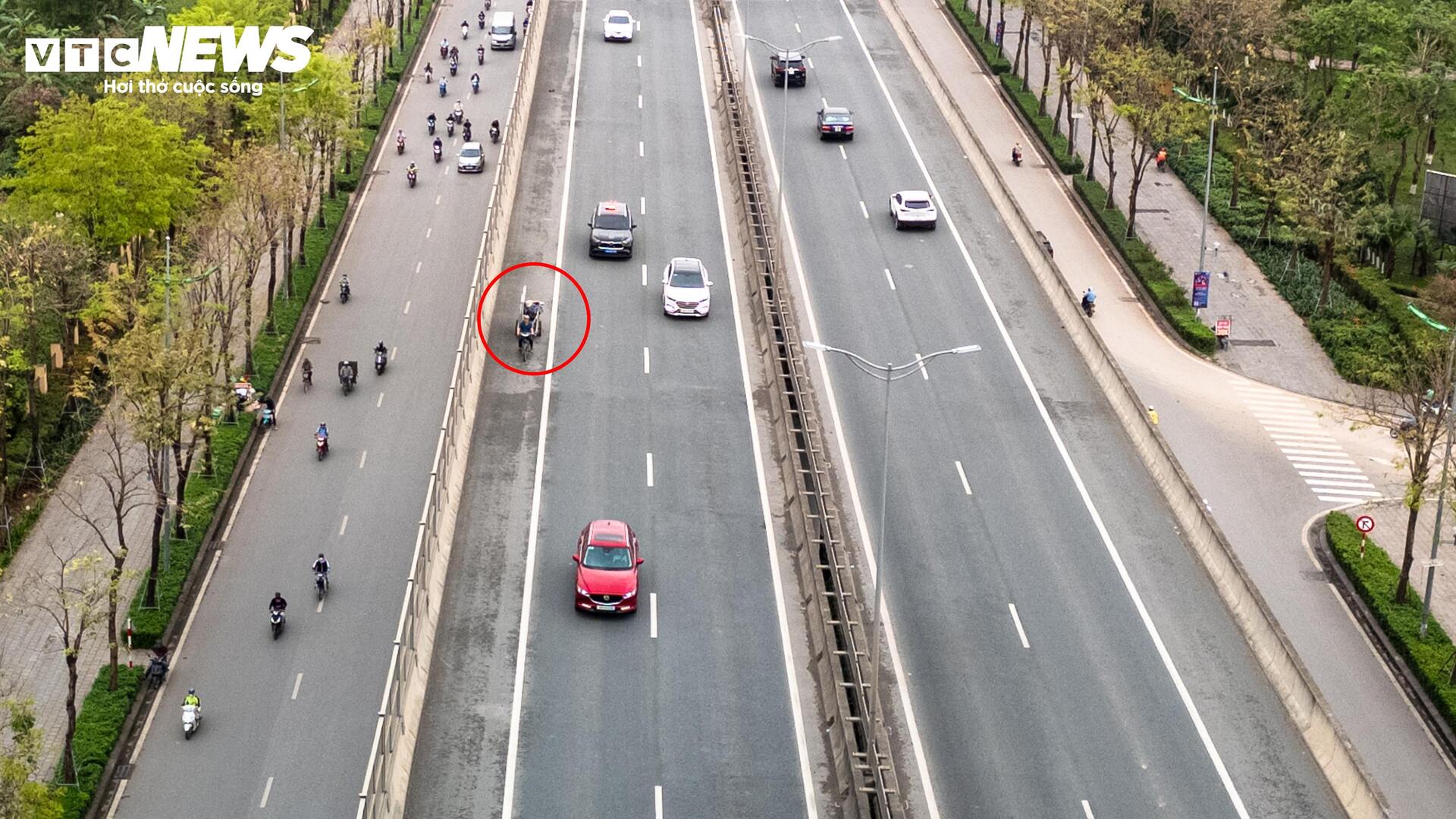 Không chỉ xe máy, một số phương tiện thô sơ như xe ba gác cũng ngang nhiên chạy lên tuyến đường này. Những phương tiện có tốc độ chậm di chuyển giữa dòng xe lớn khiến tình huống giao thông trở nên khó kiểm soát, đặc biệt trong điều kiện lưu lượng xe đông.