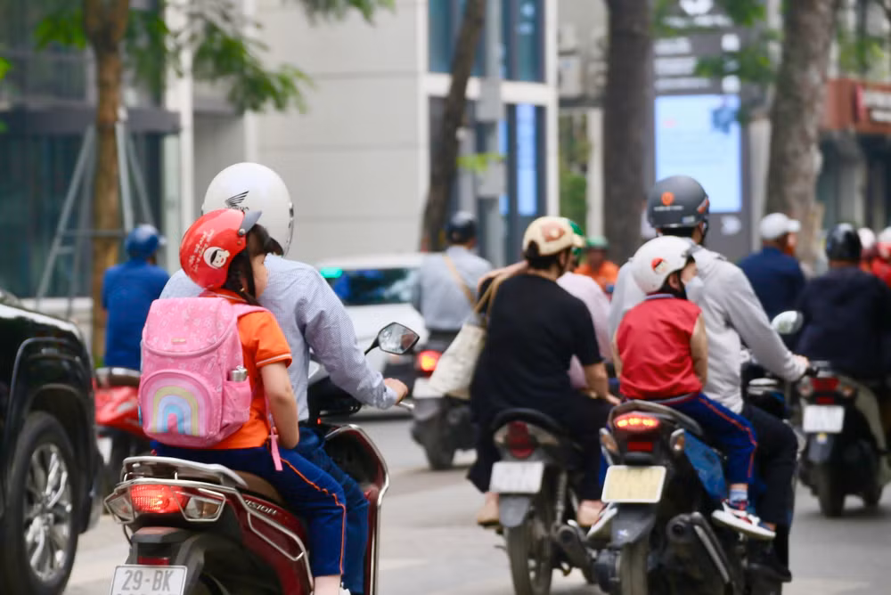 Vào khung giờ cao điểm buổi sáng tại khu vực nút giao Lý Thường Kiệt - Quang Trung (phường Cửa Nam, thành phố Hà Nội) không ít trường hợp “quên” mũ bảo hiểm cho con