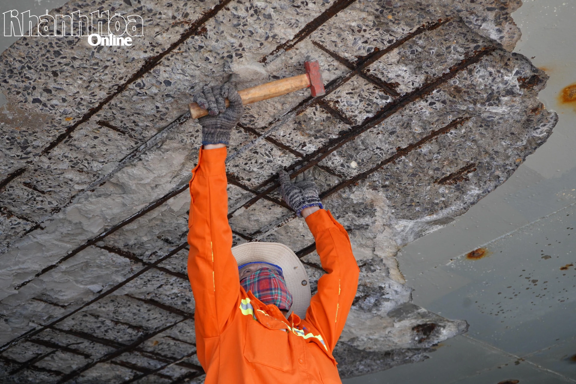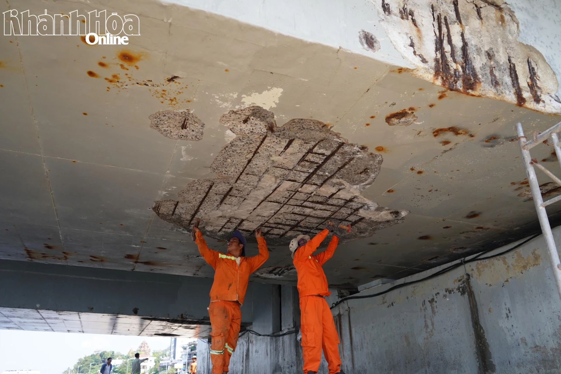 Công nhân xử lý các vị trí xuống cấp ở gầm cầu.