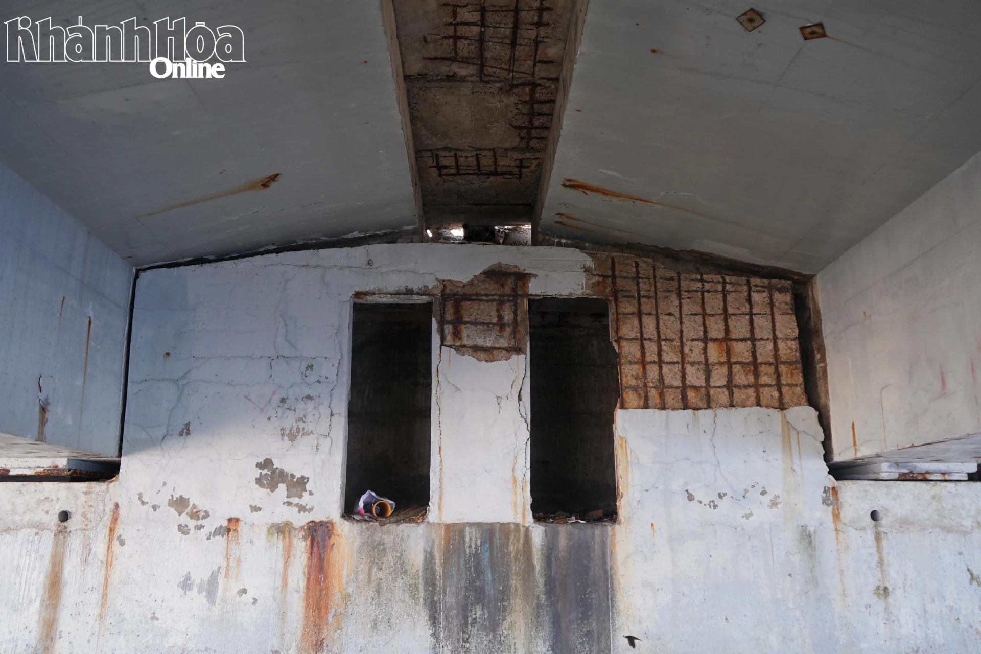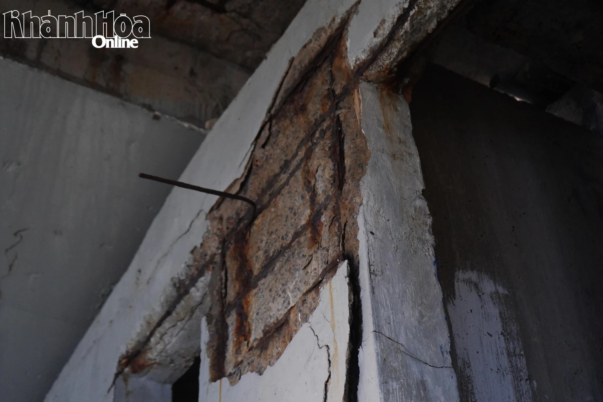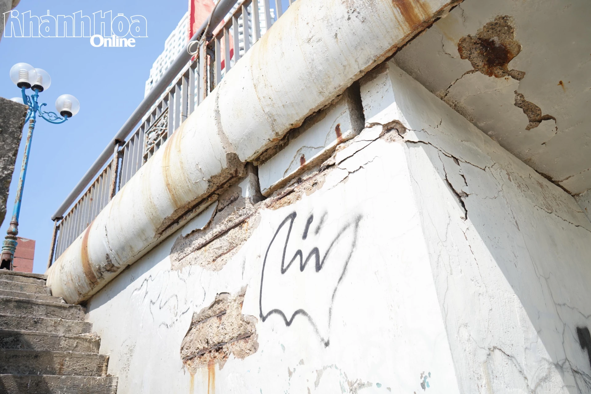Bê tông bị bong tróc, lòi khung sắt hoen gỉ.