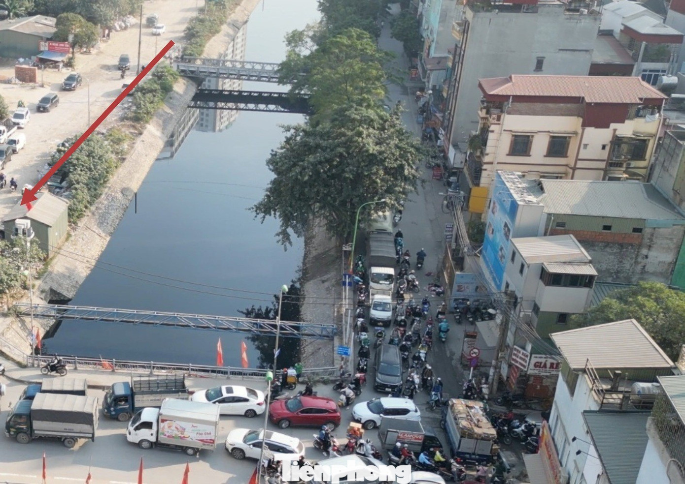 Đường Nguyễn Cảnh Dị (phía bờ nam sông Lừ) xấu, xuống cấp, nên xe đang đổ dồn sang đường Trịnh Đình Cửu phía bờ đối diện để lưu thông, khiến tuyến đường này thường xuyên ùn tắc. Ảnh chụp chiều 29/11/2025.