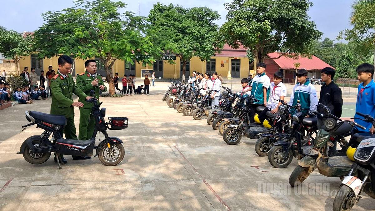 Công an xã Minh Quang tuyên truyền, hướng dẫn kỹ năng lái xe an toàn cho học sinh Trường Phổ thông Dân tộc bán trú Tiểu học và THCS Hồng Quang.