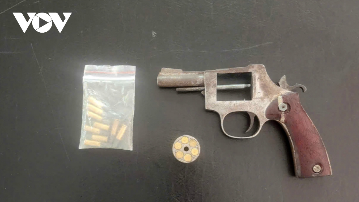 Súng và đạn thu giữ của Lê Thái Hà, trong đó có 6 viên ở trong hộp tiếp đạn.