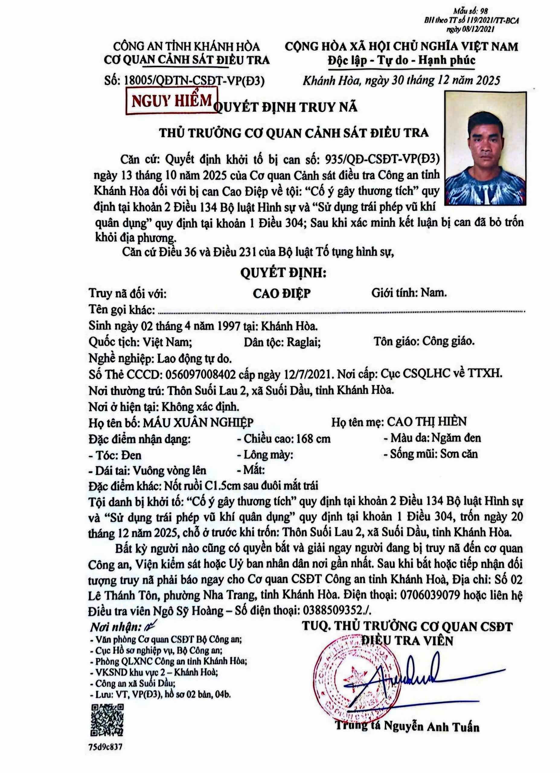 Quyết định truy nã đối tượng Cao Diệp của Công an tỉnh Khánh Hòa