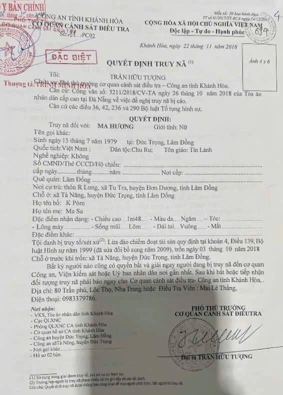 Đối tượng Ma Hương bị Công an tỉnh Khánh Hòa ra Quyết định truy nã đặc biệt số 11/PC02 ngày 22/11/2018 về hành vi lừa đảo chiếm đoạt tài sản.