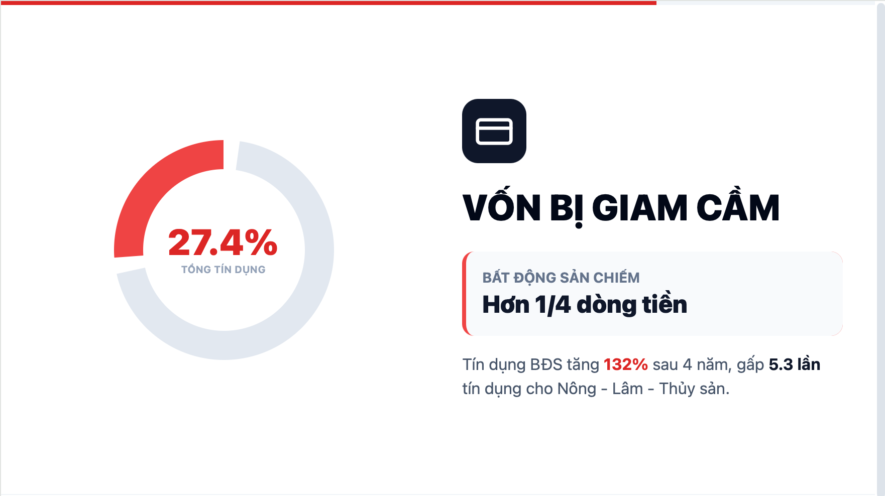 Tốc độ này gấp 2,4 lần tốc độ tăng trưởng của ngành công nghiệp. Đáng chú ý hơn, lượng vốn đổ vào bất động sản hiện lớn gấp 5,3 lần so với lĩnh vực nông, lâm, thủy sản - những ngành trực tiếp tạo ra giá trị xuất khẩu và việc làm bền vững cho hàng triệu lao động. Năm 2025, riêng bất động sản và xây dựng đã chiếm tới 27,4% tổng tín dụng toàn hệ thống.