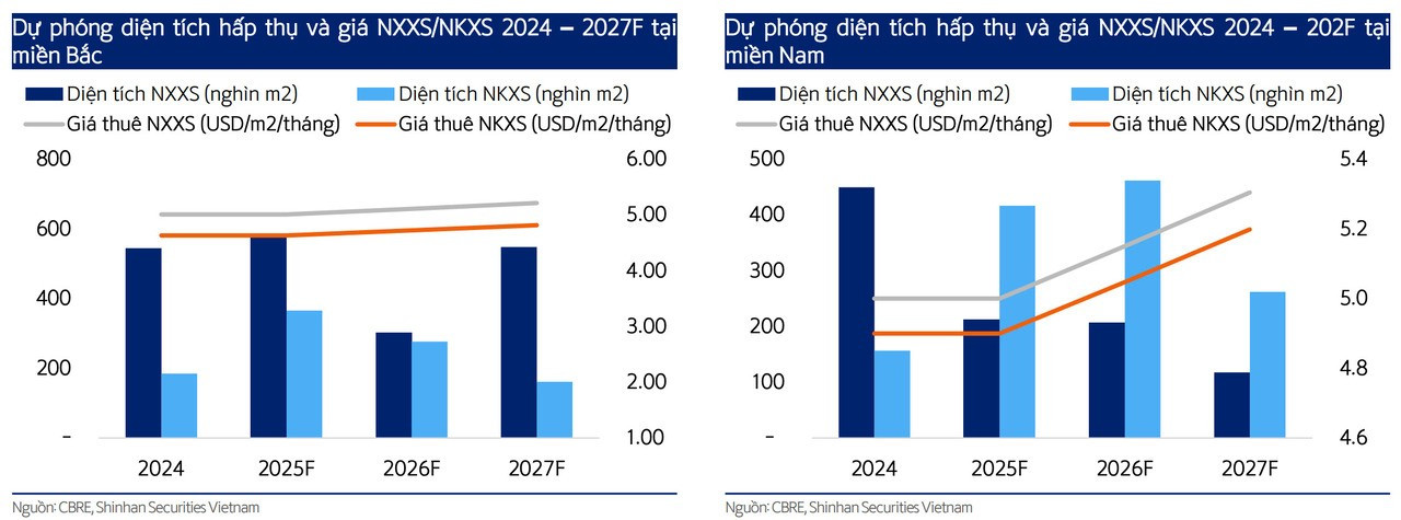 Báo cáo của Shinhan Securities cũng cho biết, trong 6 tháng đầu năm 2025, khu vực miền Bắc ghi nhận diện tích hấp thụ sụt giảm nhẹ đạt 353ha, với tỷ lệ lấp đầy đạt 80,5%. Khu vực miền Nam ghi nhận diện tích hấp thụ giảm nhẹ với tổng diện tích hấp thụ đạt hơn 168 ha, tỷ lệ lấp đầy đạt 85,3%. Giá thuê trung bình khu vực miền Bắc đạt 165 USD/m2/chu kỳ (tăng 4,9% theo năm), giá thuê trung bình khu vực miền Nam đạt 207,9 USD/m2/chu kỳ (tăng 2,2% theo năm).