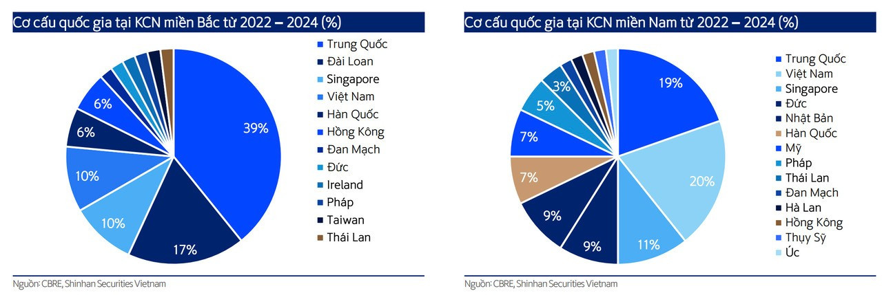 Theo dữ liệu từ các dự án giai đoạn 2022–2024 do CBRE thống kê, các doanh nghiệp Trung Quốc chiếm khoảng 39% trong cơ cấu dòng vốn FDI tại các khu công nghiệp phía Bắc. Tỷ trọng lớn này xuất phát từ lợi thế vị trí địa lý của khu vực phía Bắc, gần biên giới Trung Quốc, tạo điều kiện thuận lợi cho việc vận chuyển và giao thương hàng hóa.