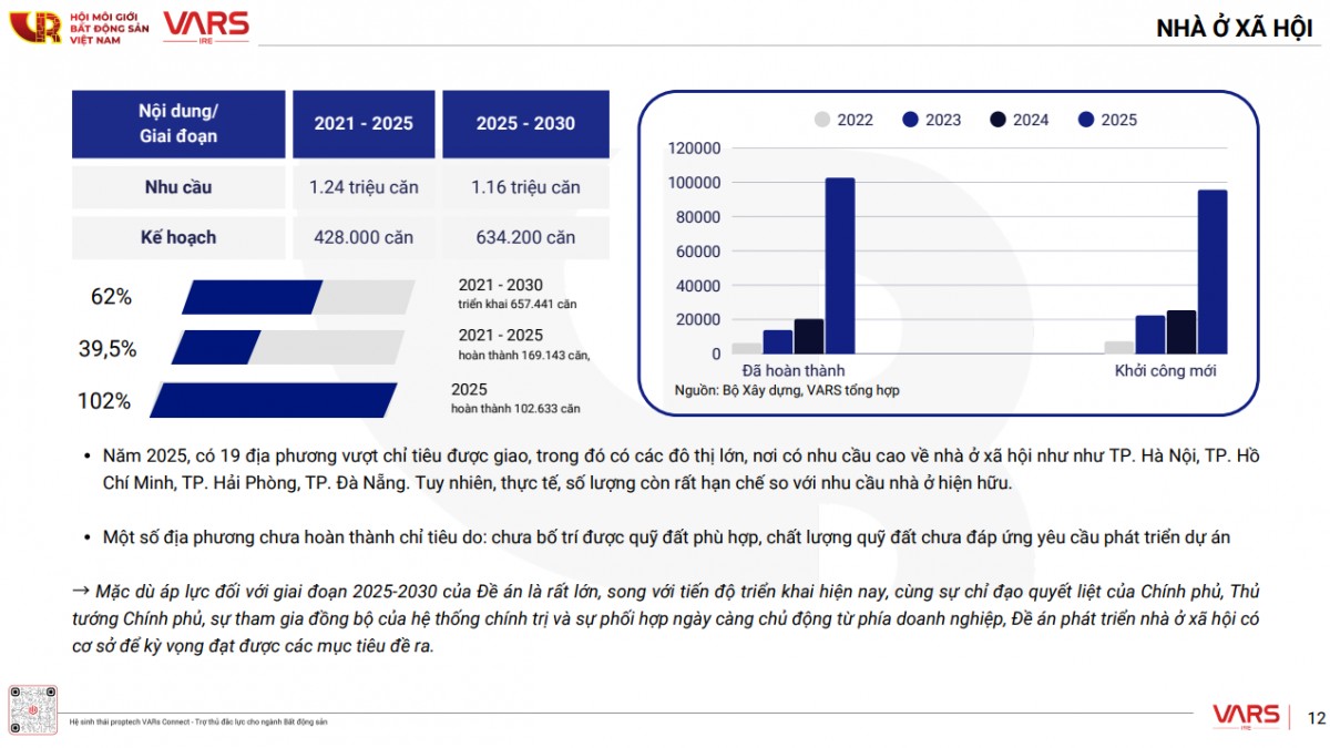 Tiếp tục phân tích báo cáo, theo bà Phạm Thị Miền, Trưởng ban Nghiên cứu thị trường VARS, trong khi nhà ở thương mại ngày càng đắt đỏ, nhà ở xã hội được kỳ vọng là “lối ra” cho người thu nhập thấp và trung bình. Theo thống kê, nhu cầu nhà ở xã hội giai đoạn 2021 - 2025 lên tới 1,24 triệu căn, nhưng thực tế đến hết năm 2025, cả nước mới hoàn thành khoảng 102.633 căn, tương đương 39,5% kế hoạch.