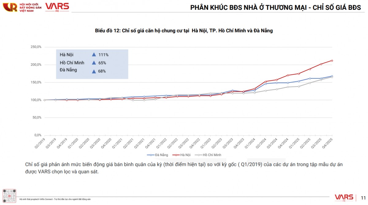 Mặt bằng giá tiếp tục neo ở mức cao, khi giá căn hộ chào bán mới tại Hà Nội đạt trung bình 100 triệu đồng/m2, tăng 40% so với năm 2024 (YoY); tại TP HCM là 111 triệu đồng/m2, tăng 23% YoY; Đà Nẵng là 83 triệu đồng/m2, tăng 14% YoY.