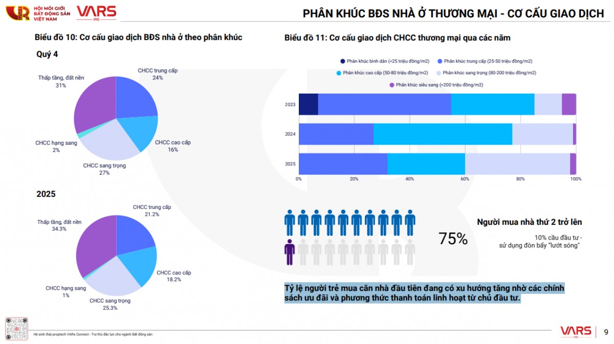 Khoảng 75% giao dịch đến từ nhóm người mua nhà thứ hai trở lên, trong đó có tỷ lệ đáng kể sử dụng đòn bẩy tài chính để “lướt sóng”. Điều này lý giải vì sao dù giao dịch tăng mạnh, người dân có nhu cầu an cư vẫn khó tiếp cận nhà ở phù hợp, ông Chung nói.