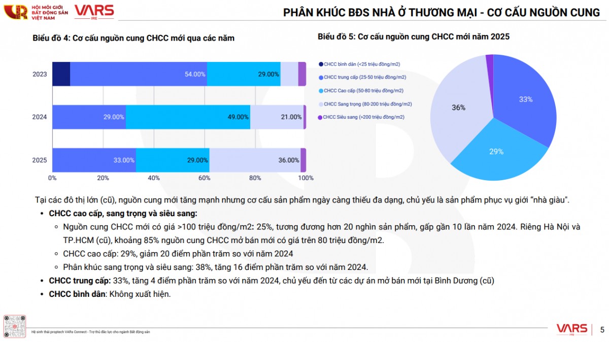 Trong tổng nguồn cung năm 2025, 62% là căn hộ chung cư, 38% là nhà thấp tầng, đất nền. Đáng chú ý, căn hộ bình dân hoàn toàn không xuất hiện, phần lớn nguồn cung mới tập trung vào phân khúc cao cấp, sang trọng và siêu sang.