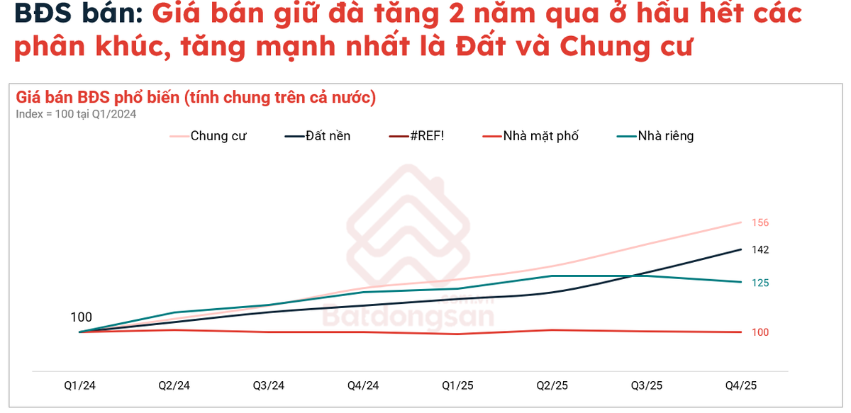 Xét trên bình diện dài hạn, giá rao bán bất động sản trên toàn quốc duy trì đà tăng trong suốt 2 năm qua. Chung cư là phân khúc ghi nhận mức tăng mạnh nhất, phản ánh áp lực nguồn cung hạn chế trong khi nhu cầu vẫn ở mức cao, đặc biệt tại các đô thị lớn. Tính đến Quý IV/2025, giá rao bán trung bình chung cư toàn quốc đã tăng 56% so với Quý 1/2024.
