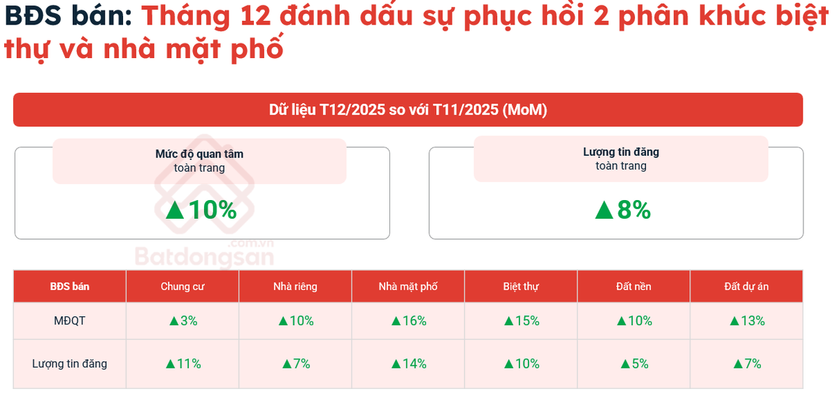 Theo dữ liệu của nền tảng công nghệ Batdongsan.com.vn, mức độ quan tâm đối với nhà mặt phố trong tháng 12/2025 tăng khoảng 16%, biệt thự tăng khoảng 15% so với tháng 11. Lượng tin đăng bán ở hai phân khúc này cũng tăng trưởng hai chữ số.