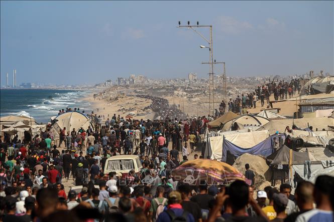 Người tị nạn Palestine quay trở về nhà ở thành phố Gaza ngày 10/10/2025. Ảnh: THX/TTXVN